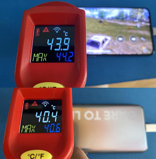 在運(yùn)行大概30分鐘左右后,如上畫質(zhì)下《和平精英》幀率可穩(wěn)定保持在30幀上下,浮動在1-2幀之間,溫度測試如下,正面最高溫度大概在44℃,背部最高溫度大概在40.5℃,溫度在可接受的范圍內(nèi)。