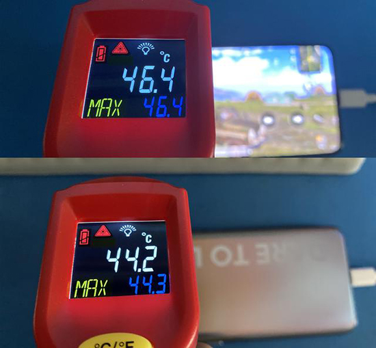在極限幀率下,《和平精英》的幀率可穩(wěn)定在55-60之間,但溫度卻上來了,測得溫度如下,正面最高46.4℃,背部最高44.2℃,正面溫度已經(jīng)有略微燙手了。