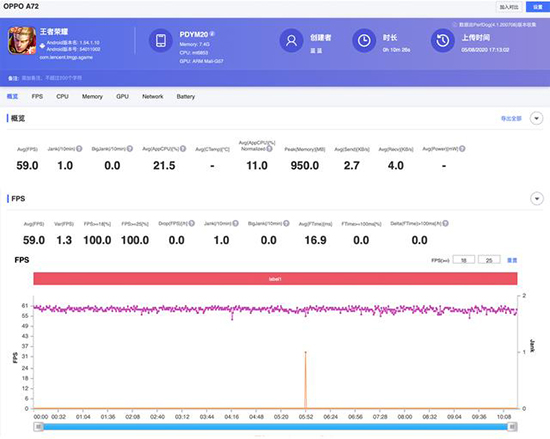 進(jìn)入《王者榮耀》游戲界面的速度很快,不拖沓也無需等待。同時得益于5G的加持,在實(shí)際更新游戲內(nèi)容的時候,速度也十分快速,不會和此前4G一樣需要較長時間等待。而在最高畫質(zhì)模式的最高幀率進(jìn)行游戲時,加持天璣720的OPPO A72展現(xiàn)了流暢的游戲體驗(yàn)。無論是在前期對線,還是后期多次大規(guī)模的團(tuán)戰(zhàn)中,都十分穩(wěn)定。我們從幀率圖中也可以清楚看到,OPPO A72能夠穩(wěn)定在59幀左右,波動也在1左右。