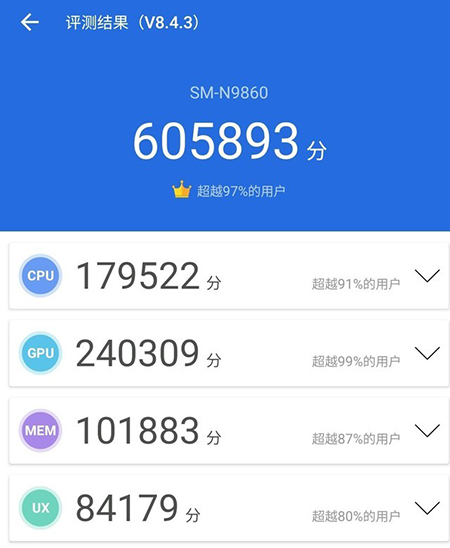 在安兔兔的跑分測試中,三星Galaxy Note20 Ultra 5G取得了605893分的好成績;并在3DMark的Sling Shot測試中取得了9040分的高分,這樣的性能表現(xiàn)完全可以滿足多樣化的應(yīng)用需求。