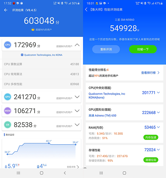 筆者用安兔兔和魯大師兩款性能測試APP對其進(jìn)行了跑分測試,前者得分為60.3萬,而后者跑分也為54.9萬,這個得分也是目前最高水平,在跑分過程中溫度的控制也比較理想。