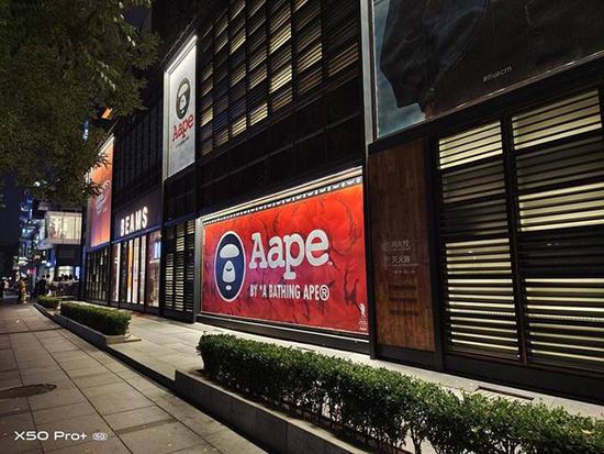 在白天對比外,夜景拍攝如今已經(jīng)成為了手機拍照對比的重要項目,也是華為旗艦的傳統(tǒng)優(yōu)勢。在實際樣張對比中,華為P40 Pro+的樣張的確相當明亮,細節(jié)也更加豐富,不過原本紅色的Aape廣告牌在畫面中有變黃的問題,看得出RYYB陣列的偏色問題還是存在。而vivo X50 Pro+采用的5000萬像素大底主攝在整體亮度和細節(jié)方面沒有太大差距,也沒有出現(xiàn)偏色的問題,能夠更好的還原現(xiàn)實的場景。