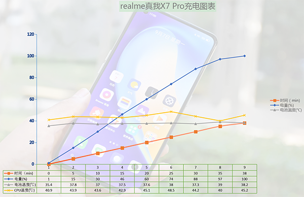 實際充電體驗中發(fā)現(xiàn),真我X7 Pro確實擔得起閃充一說,實測38分鐘就能充滿手機,與官方給出的充電數(shù)據(jù)基本一致,具體充電時效我也有繪制成折線圖直觀呈現(xiàn),如下圖所示: