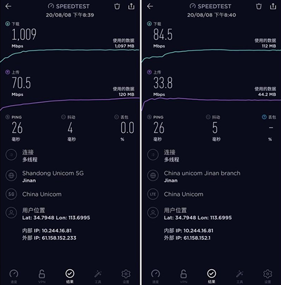 經(jīng)過測(cè)試發(fā)現(xiàn),在中國(guó)聯(lián)通5G網(wǎng)絡(luò)情況下,小米10至尊版速度實(shí)測(cè)下行速率達(dá)到1009Mbps,上行速率達(dá)到了84.5Mbps;聯(lián)通4G速度實(shí)測(cè)下行速率為70.5Mbps,上行速率則是33.8Mbps。對(duì)比普通4G網(wǎng)絡(luò)的84.5Mbps的下行速率,5G網(wǎng)絡(luò)提升到了前者11.9倍以上。