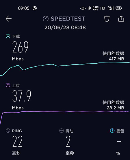 1、先放到OPPO Reno4 Pro上,可以看到5G網(wǎng)絡(luò)下載速率達(dá)到了(平均,下同)269Mbps,上傳速率達(dá)到了37.9Mbps。