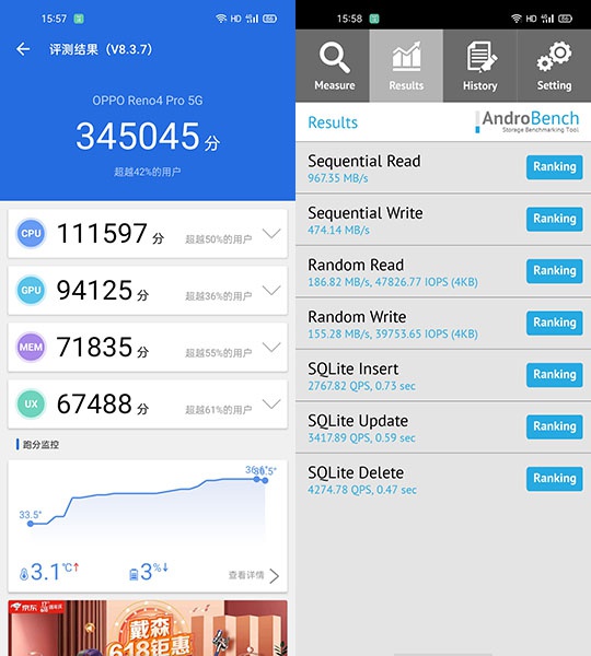 性能表現(xiàn)方面,OPPO Reno4 Pro在安兔兔評測的跑分成績?yōu)?4萬分以上,表現(xiàn)出了高通驍龍765G的正常水準。同時,它擁有8GB+128GB與12GB+256GB兩種存儲配置,適合不同人群,足以應(yīng)對用戶的日常需求。