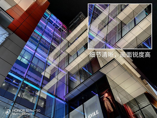 在第二組對比中,使用兩部手機(jī)進(jìn)行了夜景的建筑拍攝,因?yàn)閳鼍爸薪ㄖ旧泶嬖诤芏喙庠?,所以這一場景對于手機(jī)的夜景成像算法頗具挑戰(zhàn),對于主攝成像的難度也有所增加。我們可以看到榮耀30 Pro+的整體表現(xiàn)十分出色,其不但很好的還原了建筑玻璃墻的細(xì)節(jié)而且畫面的銳度也很不錯;小米10 Pro的主攝也同樣呈現(xiàn)出了較好的成像效果。