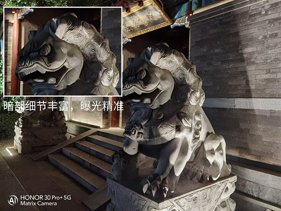接下來,我們先選擇了一座雕像作為拍攝對象,拍攝環(huán)境中存在少量的背景燈光,目的在于測試暗光環(huán)境下誰能更好的還原暗部細(xì)節(jié)、以及解析力的強(qiáng)弱。從樣張中我們看出兩者的整體觀感相差不多,但其調(diào)色風(fēng)格各有差異,不過在將圖片放大觀察對比解析力的情況下,我們可以發(fā)現(xiàn)榮耀30 Pro+拍攝的雕像局部細(xì)節(jié)和光影層次更為豐富。