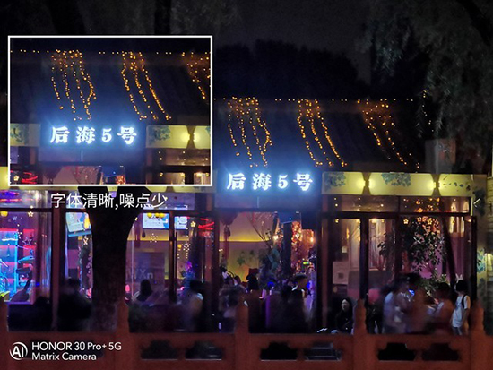 我們可以看出榮耀30 Pro+所拍攝畫面更為清晰,可以明顯分辨出遠(yuǎn)處招牌上的文字,而小米10 Pro則出現(xiàn)了明顯的模糊效果并且涂抹感很強(qiáng),很難分辨出遠(yuǎn)處招牌上的文字,而且招牌上的燈光也完全模糊成光團(tuán),影響觀感。
