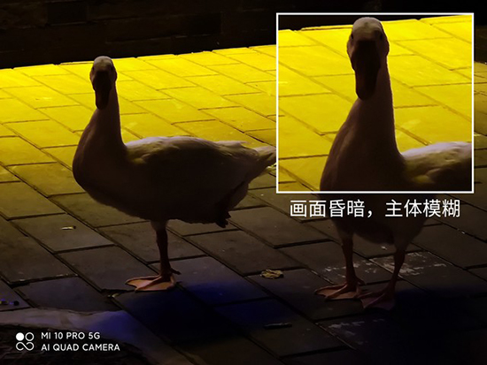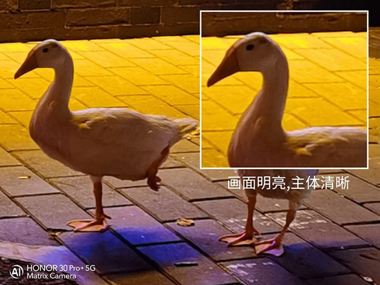 5X長(zhǎng)焦拍攝模式可以幫助我們完成演唱會(huì)或者是小動(dòng)物特寫的拍攝。從對(duì)比的樣張中,我們可以很明顯的看出在5X長(zhǎng)焦模式下,榮耀30 Pro+的長(zhǎng)焦鏡頭的成像畫面更為明亮且更為清晰,小鴨子眼部特征和暗處的羽毛被完整的還原。