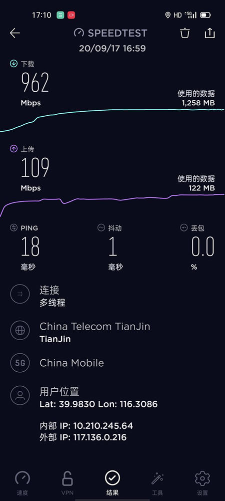 經(jīng)過(guò)SpeedTest測(cè)速結(jié)果顯示,OPPO Reno4 SE在5G網(wǎng)絡(luò)環(huán)境中能夠達(dá)到962Mbps的下載速度美,以及109Mbps的上傳速度,特別是下載速度直逼運(yùn)營(yíng)商限速天花板。