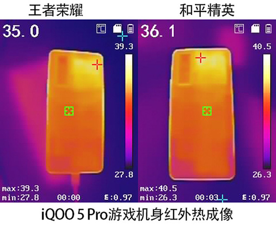 發(fā)熱方面,iQOO 5 Pro傳奇版在升級(jí)了一塊面積更大的VC液冷均熱板。從連續(xù)游戲的機(jī)身紅外熱成像來看,機(jī)身的熱量傳遞也比較均勻。在24℃的空調(diào)環(huán)境中,連續(xù)游戲也不會(huì)出現(xiàn)燙手的情況。當(dāng)然對(duì)于游戲玩家來說,也可以考慮額外的散熱設(shè)備,如背夾風(fēng)扇。