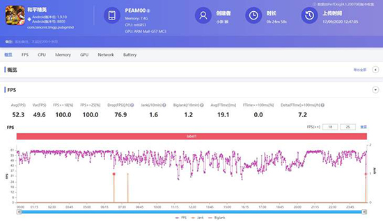 由圖可見,在高畫質(zhì)60幀、抗鋸齒打開的情況下,OPPO Reno4 SE的平均幀可以達(dá)到52幀左右。游戲中大部分場(chǎng)景都能保持在40幀以上,只有少數(shù)高速駕駛載具的場(chǎng)景幀率會(huì)稍低一些,不過最低也有30左右,整個(gè)過程幾乎沒有明顯的卡頓感,如果追求更穩(wěn)定的幀率,也可以適當(dāng)降低畫質(zhì)。