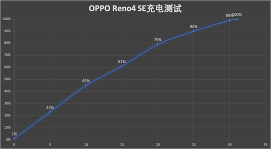 我們將OPPO Reno4 SE電量耗光,從1%的電量開始充電,實(shí)測(cè)31分鐘就可以“完全充滿”,而算上涓流充電完全充滿手機(jī)也只需要39分鐘,和官方宣稱的37分鐘完全充滿基本在誤差范圍內(nèi)。這樣4300mAh的電池幾乎在半小時(shí)就能充滿,速度實(shí)在是夠驚人的。