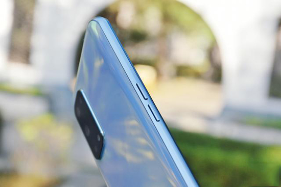 后殼到中框部分過渡自然,弧度優(yōu)美圓潤,沒有割手感,握在手上就很舒適,金屬中框很有質(zhì)感,左右兩側(cè)分別是音量增減鍵和電源鍵,外緣光滑,按壓靈敏,其中電源鍵于細(xì)節(jié)進(jìn)行特殊處理,增添真我獨(dú)有的黃色標(biāo)志,比較吸睛。