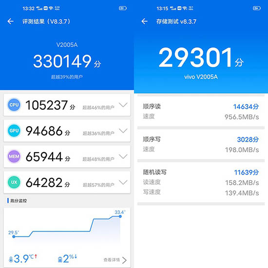 vivo X50 Pro采用最新的高通驍龍765處理器,依靠高通驍龍756G平臺(tái)提供的完善支撐,配合8GB LPDDR4X+256GB雙通道UFS 2.1存儲(chǔ),vivo X50 Pro在基礎(chǔ)性能方面也有一定保障。安兔兔跑超過(guò)33W分,存儲(chǔ)跑分超過(guò)2.9W,在同級(jí)別的手機(jī)處于主流水平,沒(méi)有明顯短板,不過(guò)和頂級(jí)處理器還是有一定差距的。