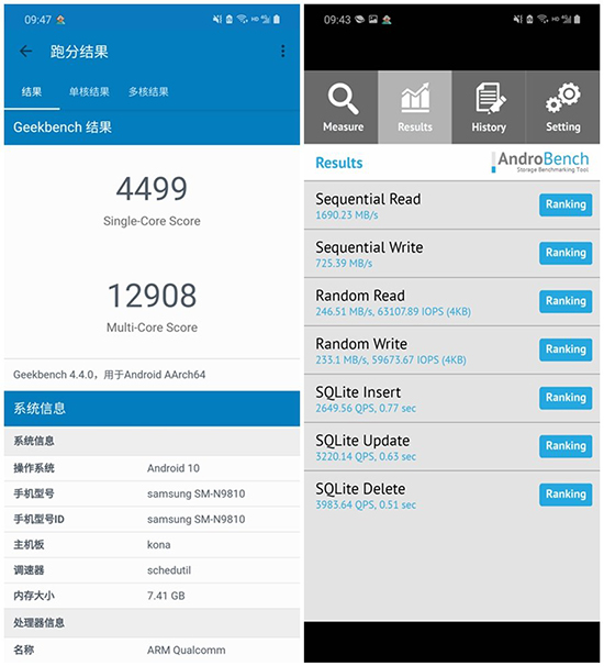在針對CPU性能的Geekbench 4.4.0軟件基準測試中,三星Galaxy Note20 5G獲得單核4499分,多核12908分,分數(shù)成績位于前列。在針對手機存儲性能的AndroBench5.0軟件的基準測試中,Galaxy Note20 5G順序讀取速度為1690.23MB/s,順序?qū)懭胨俣葹?23.39MB/s,儼然UFS 3.1閃存規(guī)格。