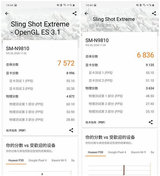 在針對GPU性能的3DMark軟件基準測試中,三星Galaxy Note20 5G手機的Sling Shot Extreme-OpenGL ES3.1獲得7575分,Sling Shot Extreme-Vulkan獲得6836分,性能表現(xiàn)遙遙領(lǐng)先其它手機。