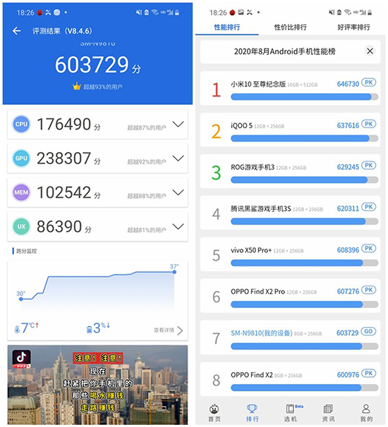 在安兔兔軟件基準測試中,三星Galaxy Note20 5G獲得603729分,突破60萬分大關(guān),其中CPU獲得176490分、GPU獲得238307分、MEM獲得102542分,UX獲得86390分,整體性能位于排行榜中第七名。