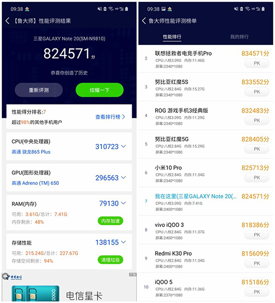 在魯大師軟件基準測試中,三星Galaxy Note20 5G手機獲得了824571分,其中CPU獲得310723分,GPU獲得296563分,RAM內(nèi)存獲得79130分,ROM存儲性能獲得138155分,同樣位于手機性能排行中第七位。