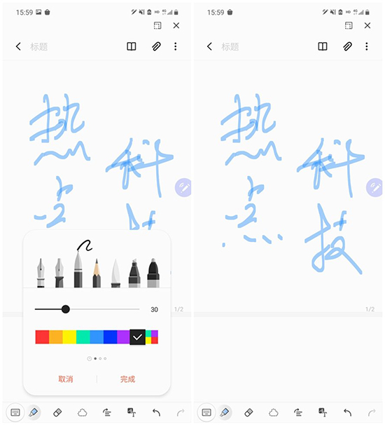 在實(shí)際體驗(yàn)方面,當(dāng)從手機(jī)中撥出S Pen,便會出現(xiàn)創(chuàng)建筆記、智能多截圖、截屏速寫、AR涂鴉等功能,其中創(chuàng)建筆記功能,在做一些會議速記更為快速,非常適合辦公人士使用。當(dāng)使用S Pen做筆記時(shí),其可充當(dāng)鋼筆、毛筆、鉛筆、涂鴉筆等不同種類筆,以不同筆形的形式進(jìn)行書寫,書寫的手感與真筆相差無幾,而這種形式也是“鍵盤”所無法替代的。