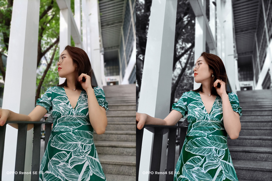 而后置鏡頭方面,比起普通的人像模式,開啟人像留色之后,整體視覺高級感提升不少。從下面這組對比樣張來看,在默認人像模式輸出時背景也做了一定的虛化處理,小姐姐的膚色、裙子色彩都沒有出現(xiàn)偏離,再配合點到為止的美顏效果,確實是呈現(xiàn)了不錯的人像拍攝效果,在人像拍攝方面OPPO Reno4 SE給出的答卷還是讓人比較滿意的。