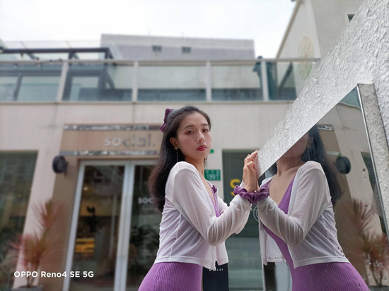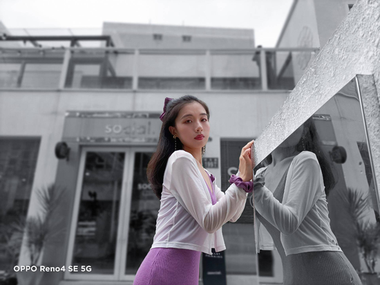我們先來看自拍,依靠3200萬像素前置相機,OPPO Reno4 SE自拍能拍出更多細節(jié)畫面。最關鍵的是,AI智慧美顏可以根據(jù)不同年齡、性別、場景匹配專屬美顏方案,不會有過度磨皮的那種粗劣PS效果。而前面提到的人像留色功能,Reno4 SE的前置鏡頭也支持這個玩法,背景虛化的同時讓人物色彩更突出,觀感還是很不錯的。