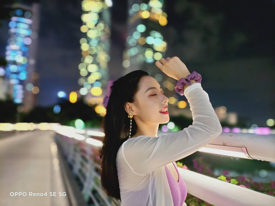 當然如果是更熱衷于照片背景色彩一致化的話,那么OPPO Reno4 SE的夜景光斑人像模式無疑是非常適合的。經(jīng)過實測,在開啟霓虹人像模式后,背景不僅進一步做了虛化處理,并且還將光源處理成光斑一樣的效果。