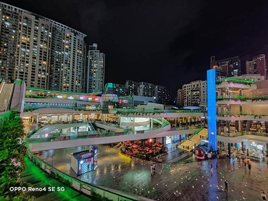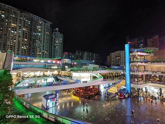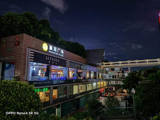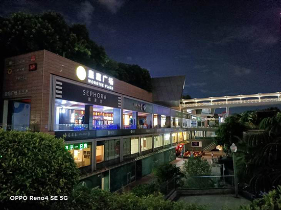 OPPO Reno4 SE還支持夜景模式,夜景模式下會通過多幀疊加HDR,實現(xiàn)更好的畫面效果。夜景模式下的樣張整體對比度更高,對高光部分更近一步壓制,可以看到燈箱上的字體更加清晰,畫面整體噪點更少,更加純凈,提升整體觀感。