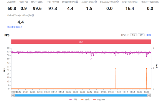 在超高分辨率、高畫質(zhì)下,《王者榮耀》平均幀率達到60.8,全程流暢運行,基本上感受不到掉幀或卡頓現(xiàn)象。