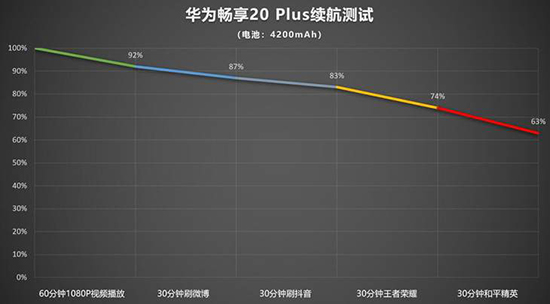 另外,在我們的五小時(shí)重度續(xù)航實(shí)測(拍照測試(30分鐘)、視頻播放測試(60分鐘)、社交測試(30分鐘)、即時(shí)通訊(30分鐘)、網(wǎng)頁瀏覽(30分鐘)、游戲測試(60分鐘)、在線音樂(30分鐘)、電子書(30分鐘))中,暢享20Plus最終剩余電量為53%,按照正常使用來算,一天一充毫無壓力。