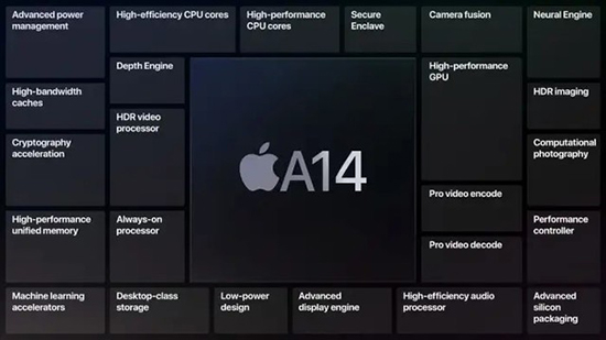 雖然A14芯片同樣采用 6核心CPU、4核心GPU,但A14擁有118億個(gè)晶體管,相比A13的85億個(gè)高出不少。同時(shí)在AI性能上,A14也有著不小的提升,搭載了全新的16核Neural Engine,核心數(shù)比前代增加一倍,最高能夠每秒處理 11 萬億個(gè)操作。