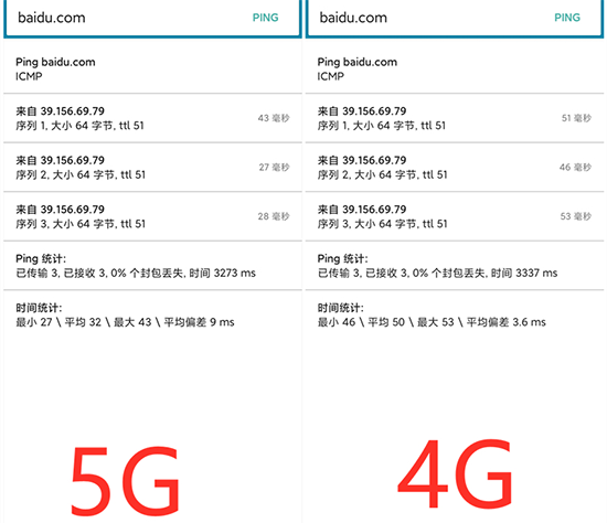 以上是小米10青春版分別在5G、4G網(wǎng)絡(luò)下ping百度的延遲表現(xiàn)??梢钥吹?G網(wǎng)絡(luò)下平均延遲為50ms,5G網(wǎng)絡(luò)下平均延遲為32ms。小米10青春版的5G平均網(wǎng)絡(luò)延遲比在4G網(wǎng)絡(luò)環(huán)境下低了大約18ms。