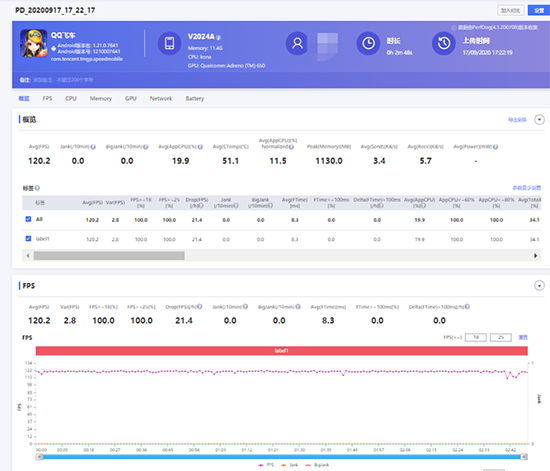 iQOO 5使用一塊120Hz的屏幕,而作為最早開放120Hz擁有很高人氣的《QQ飛車》也就自然成了必測的游戲之一,通過設(shè)置將最高幀率開啟,可以看到iQOO 5上《QQ飛車》能最高跑到120fps,一場比賽下來,整體的幀率一直維持在120左右,從曲線上來看整體的波動非常小,游戲?qū)τ趇QOO 5的120Hz屏幕帶來了非常好的支持。