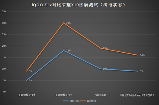 而在實(shí)際測試中,如下圖所示,在iQOO Z1x和榮耀X10滿電狀態(tài)下,同時(shí)玩一個(gè)小時(shí)《王者榮耀》后,iQOO Z1x僅消耗5%的電量,榮耀X10消耗9%的電量,同時(shí)玩3個(gè)小時(shí)《王者榮耀》后,iQOO Z1x僅消耗18% 的電量,榮耀X10則消耗30%的電量,在刷一小時(shí)抖音之后,iQOO Z1x消耗10%的電量,榮耀X10消耗19%的電量,在線看兩個(gè)小時(shí)的《隱秘的角落》之后,iQOO Z1x消耗了9% 的電量,榮耀X10消耗了16% 的電量。