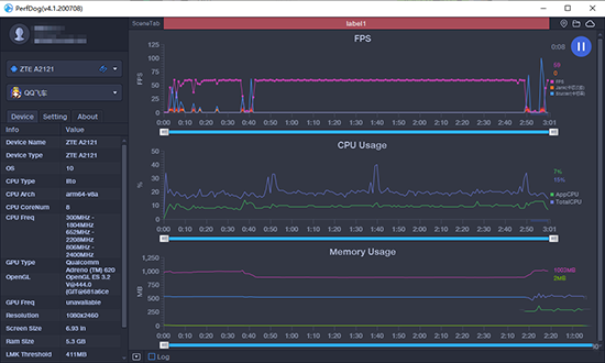 我們使用PerfDog進行了幀率采集,可以看到,在游戲過程中中興天機Axon 20的幀率十分穩(wěn)定,呈直線走勢。