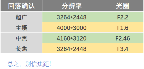 那么如何判斷已經(jīng)回落呢?在取景界面很難察覺,只能拍完以后通過照片的詳細(xì)信息辨識,注意分辨率與光圈即可,對號入座詳見下表。