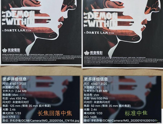 焦段回落聽起來很方便,沒錯,但對于有攝影經(jīng)驗(yàn)的用戶卻未必友好。例如下圖左,較瘦原本選擇長焦(5x)拍攝室內(nèi)海報,系統(tǒng)評估后回落到中焦(2x)裁切并放大到4160*3120。問題來啦,既然系統(tǒng)使用中焦裁切,那么較瘦走近一點(diǎn)直接用中焦拍攝豈不更好?