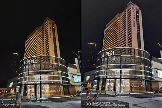 在夜晚場景下,vivo X50 Pro+和華為P40 Pro+分別擁有腳架模式和手動常曝模式,同時位置進行手持拍攝前者耗費的時間明顯更短一些,不過這并未影響畫面進光量,反倒讓等待的時間變得更短。從觀感上來說,vivo X50 Pro+的色溫較暖,飽和度更高;華為P40 Pro+則偏冷,還原度相比前者較弱。