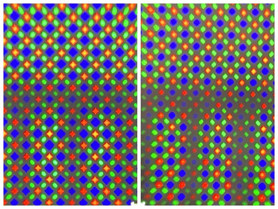 都是Pentile排列,但華星光電是標(biāo)志性的“四角星紅色子像素+略帶凸角的藍(lán)色子像素”,開口率(有效的透光區(qū)域與全部面積的比例)明顯比三星高。