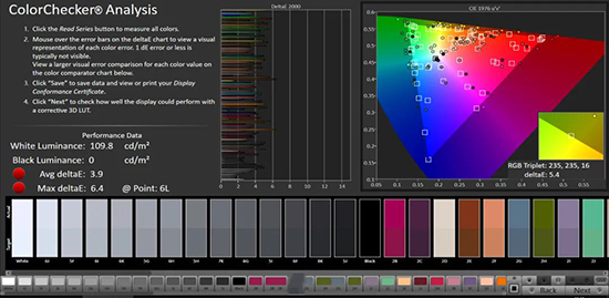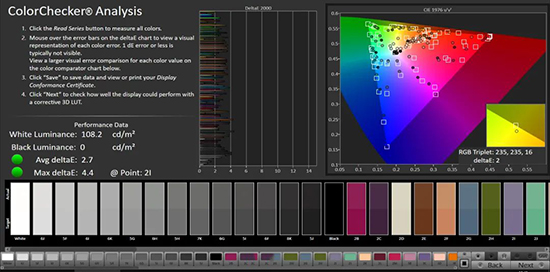 鮮艷模式表現(xiàn)不佳,并不是追著P3調(diào),可以忽略這個(gè)模式。P3色域下,99.7%P3覆蓋,2.3伽瑪值,2.5灰階偏離,平均色彩偏離5,最大偏離8.8,偏得有點(diǎn)明顯了。