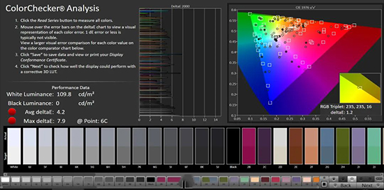 日??梢远ㄔ谀J(rèn)的自適應(yīng)模式,其在sRGB和P3色域下的色準(zhǔn)表現(xiàn)都比鮮艷模式好,兩個(gè)模式都是在7400K色溫左右。sRGB這邊,127.9%色域覆蓋,2.21伽瑪值,2.9灰階偏離,平均色彩偏離3.9,最大偏離6.4。P3這邊,96%色域覆蓋,平均色彩偏離4.2,最大偏離7.9。