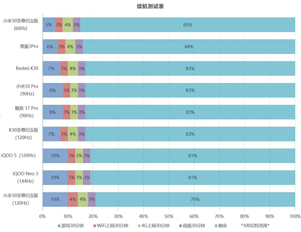 小米10至尊紀(jì)念版(也就是小米10 Ultra)搭載4500mAh電池,經(jīng)過了30分鐘游戲(NBA 2K15),各30分鐘的wifi和4/5G沖浪和30分鐘本地視頻播放,共2個小時的續(xù)航測試后,120Hz模式剩余電量79%,60Hz模式剩余電量85%。和其他120Hz機型一樣,高刷主要影響在游戲部分,對上網(wǎng)、看視頻影響不大。