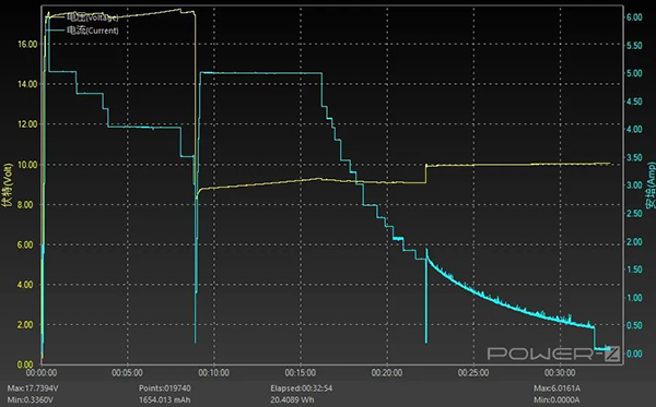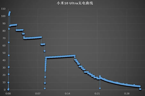 實測百瓦維持時間大約10幾秒,隨后87W、80W各維持1分鐘、70W維持4分鐘、45W維持7分鐘,隨后7分鐘曲線下降到13W,23分流鐘電量顯示100%,但還有13W輸入,隨后逐漸降低到4.6W(算是耗時8分鐘的涓流,電壓都是10V左右的),31分鐘真正充滿。就算是“偷偷涓流”,功率照樣 比蘋果五福一安快了“0.5盧”。