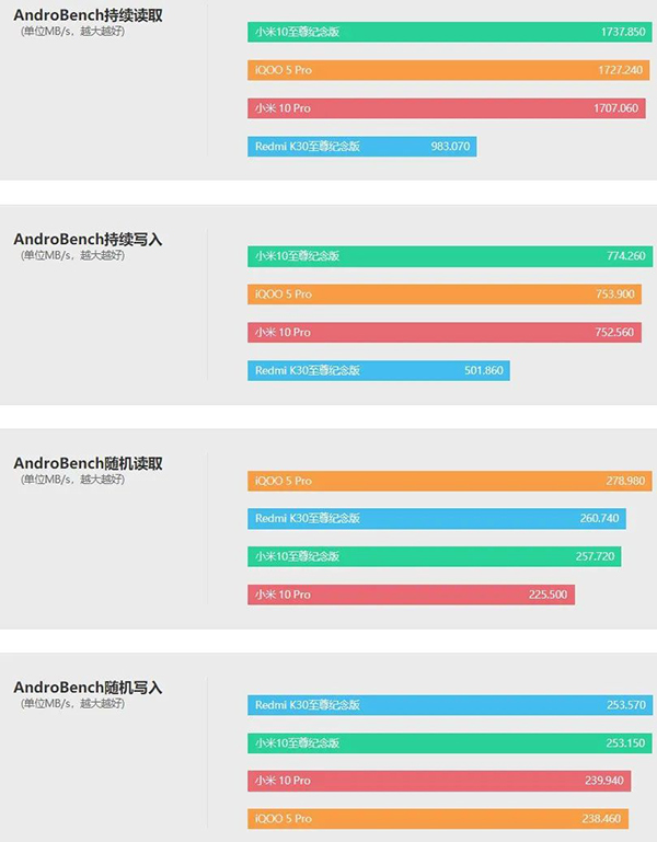 小米10至尊紀念版的實際CPU調(diào)控反而要比小米10 Pro保守,GPU稍強(一幀秒殺、兩幀吊打的差距)。倒是閃存從UFS 3.0升級到UFS 3.1后,256GB的小米10至尊紀念版,其持續(xù)讀寫速度能小勝512GB的小米10 Pro,并在隨機讀寫上拉開差距(情況一致時,閃存容量越大,速度越快)