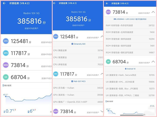 紅米Redmi 10X 5G采用天璣820處理器,采用了4顆主頻高達(dá)2.6GHz的Cortex-A76性能核心和4顆主頻2.0GHz的Cortex-A55高能效核心。GPU方面,采用ARM Mali G57 MC5,表現(xiàn)也很優(yōu)秀。安兔兔跑分38W+,基本上算是超越了驍龍765G。LPDDR4X+UFS2.1的存儲跑分也很不錯,由此可見,Redmi 10X 5G作為5G中高端市場的重量級選手是沒啥問題的。