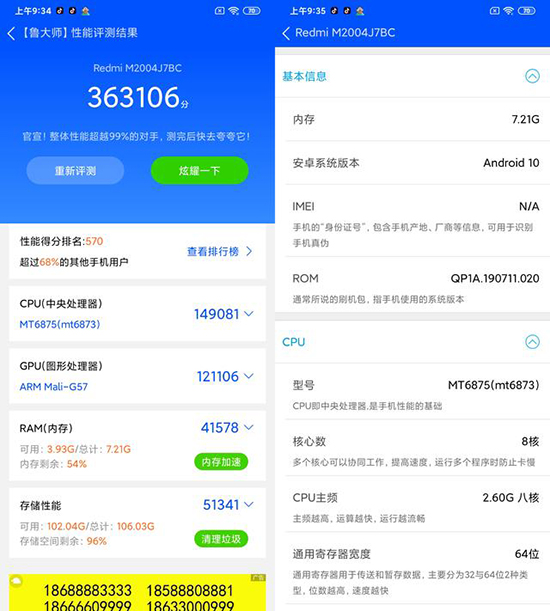 可以看到,聯(lián)發(fā)科天璣820確實表現(xiàn)不凡,安兔兔Redmi 10X Pro拿下的跑分是399462,魯大師分數(shù)是363106。在性能方面,Redmi 10X Pro的天璣820要比驍龍765G強不少,而它的魯大師跑分,也顯示出天璣820的確很強。
