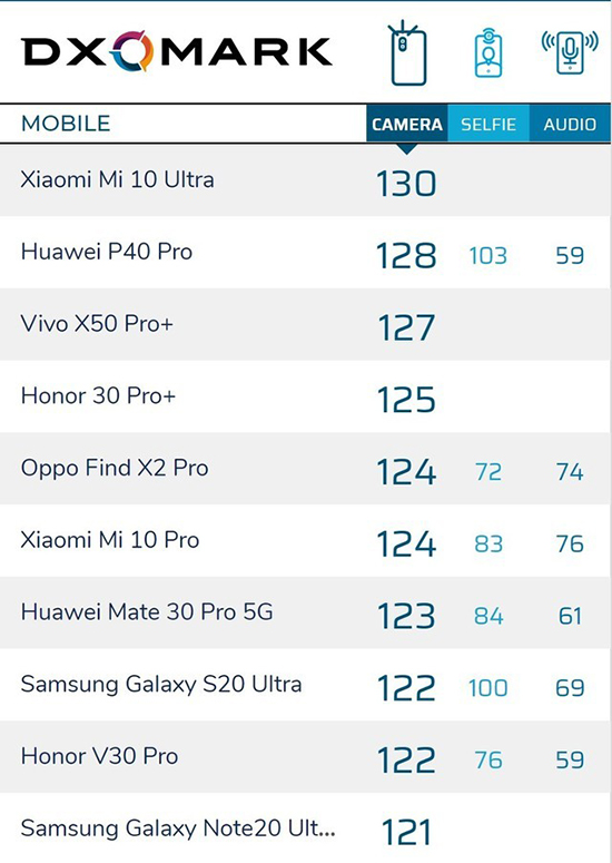 三星Note20 Ultra相機(jī)分?jǐn)?shù)為121分位居前十