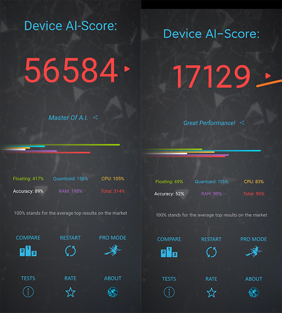 那么兩者的AI跑分究竟如何呢?這一環(huán)節(jié)選擇AI-Benchmark進(jìn)行跑分測(cè)試,麒麟820跑分高達(dá)56584分,而驍龍765G僅為17129分,差距明顯。