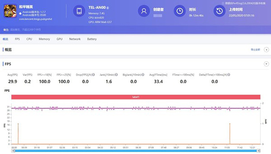 在《王者榮耀》中,榮耀X10的平均幀數(shù)為59.9幀,而且從幀數(shù)曲線來看,基本保持60幀左右。值得注意的是,這款手機(jī)的幀數(shù)條除了有幾次輕微的幀數(shù)波動(dòng),表現(xiàn)從整體來看穩(wěn)定平滑,游戲體驗(yàn)相當(dāng)不錯(cuò)。而在《和平精英》中,榮耀X10的幀數(shù)可以穩(wěn)定在30幀左右,總體表現(xiàn)穩(wěn)定。